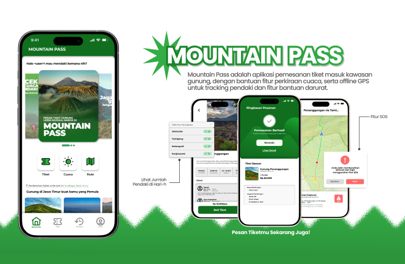 Desain UI/UX sebuah aplikasi pemesanan tiket masuk kawasan gunung dengan fitur tracking rute dan informasi cuaca.